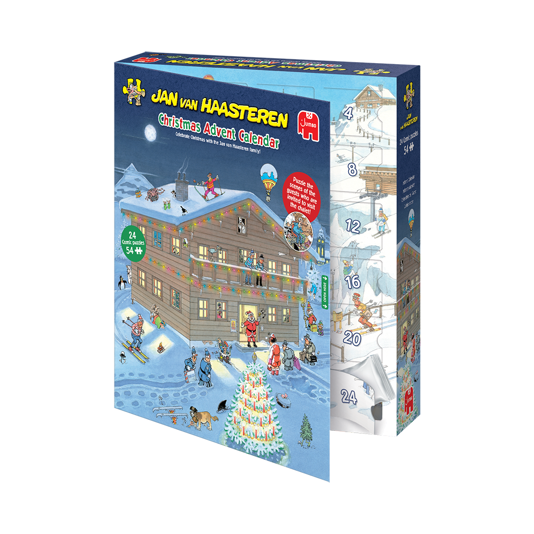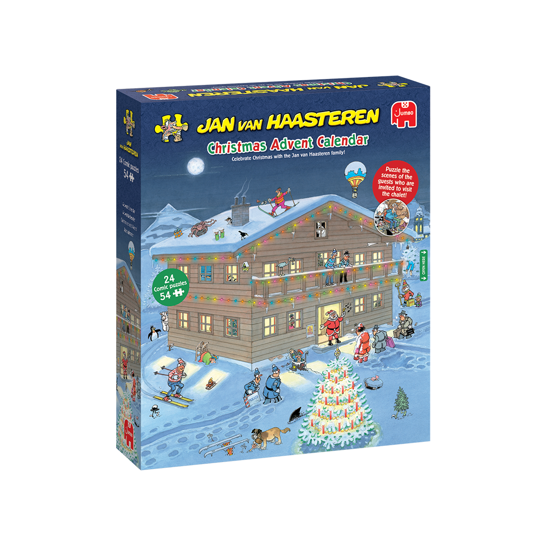Vier de feestdagen met de Jan Van Haasteren Adventskalender, een vrolijke en grappige versie van de klassieke puzzel. Deze feestelijke set bevat 24 dagelijkse puzzels, elk bestaande uit 54 stukjes, die een nieuw tafereel onthullen naarmate de gasten aankomen in een besneeuwd chalet, vol verrassingen en de kenmerkende humor van Jan Van Haasteren. Bekend om zijn levendige en gedetailleerde illustraties, worden de puzzels van Jan, geliefd bij fans over de hele wereld, geleverd met unieke stukjes voor een perfecte montage.